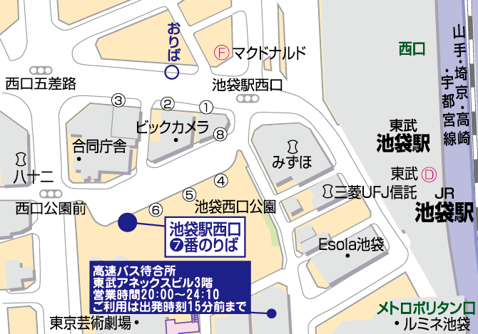 池袋西口公園のすぐ近く。ビックカメラの側で、周りには商業施設も多いため、バスの待ち時間も有意義に過ごすことができます。